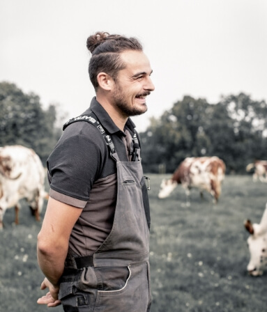 Installé au côté de son frère depuis 2022, Florentin Josse élève un troupeau des vaches normandes, une race mixte réputée pour la qualité de son lait, plus riche en matières grasses et en protéines. Son lait est ensuite livré à la laiterie du Vieux-Bourg où il est transformé en beurre, ingrédient essentiel dans nos créations.