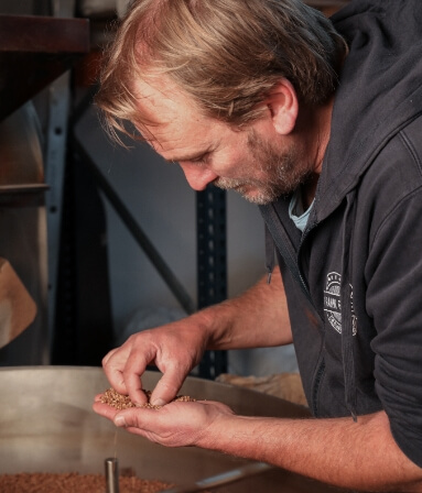 Yoann Gouéry, torréfacteur, collabore avec nous pour la création de notre sobacha. Spécialiste des alternatives au café, il torréfie des graines et céréales 100% bretonnes (orge, malt d’orge, petit épeautre, sarrasin, lupin), issues de filières paysannes locales, dont 80% sont récoltées à moins de 35 minutes de l’atelier.